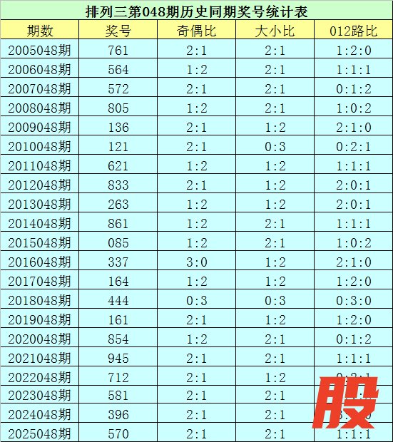 排列三第2026048期开奖日期:2026年2月27日,历史上第048期已开出了21次奖号,历年同期号码分别为:761、564、572、805、136、121、621、833、263、861、085、337、164、444、161、854、945、712、581、396、570。